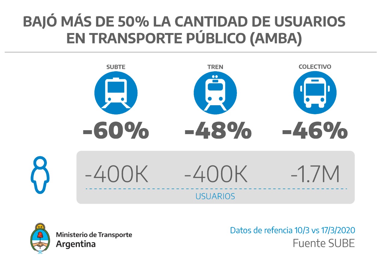 Del análisis del sistema SUBE surge que el martes 10 de marzo se registraron 4.205.201 usuarios del transporte público, entre tren, colectivo y subte en el Área Metropolitana de Buenos Aires, mientras que el martes 17, la cifra se redujo a 2.230.426, un 47 % menos en una semana. La mayor baja se registró entre los usuarios de subte.